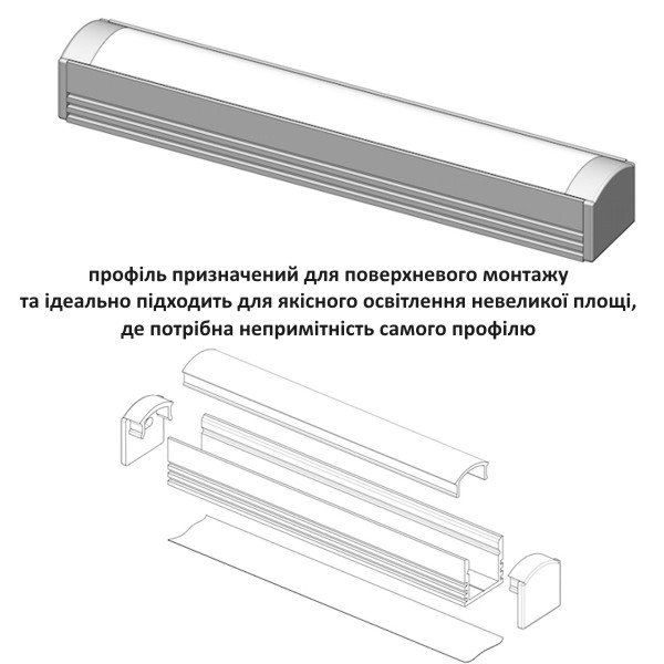Накладний профіль для лед стрічки відрізняється порівняно невеликою глибиною та компактністю. Використовується для поверхневого монтажу декоративної підсвітки, для освітлення малих площ і виготовлення авторських світильників. До сфери можливого застосування також входить: підсвічування світлодіодною стрічкою сувенірів і ювелірних прикрас, меблів і кабінок в кафе, автомобільних салонів і акваріумів, вітражів і стель кесонного типу, карнизів і плінтусів. В інтер'єрі алюмінієвий профіль є практично непомітним, тому лед підсвітка стелі або плінтусу буде виглядати особливо ефектно.