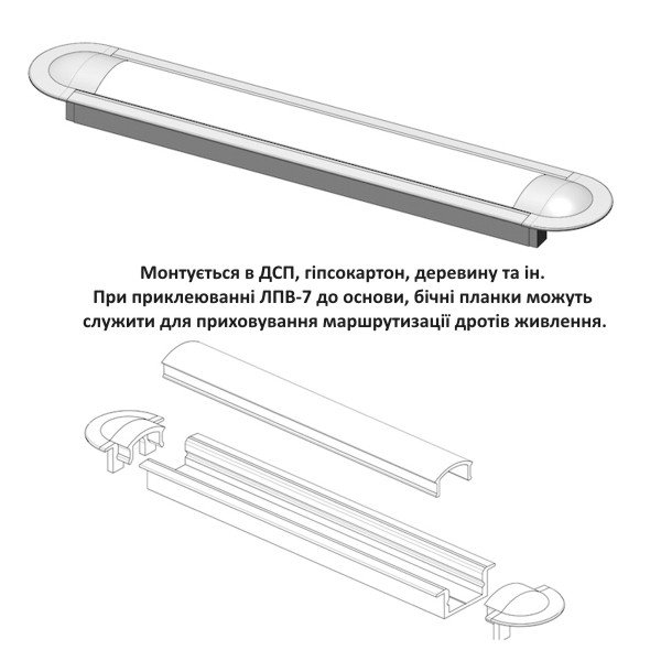 Виготовлений з міцного алюмінію, який ефективно відводить тепло, що виділяється. Запобігає перегріванню led стрічки. Профіль екранує прозора або матова лінза з полікарбонату. Можливе замовлення моделі без розсіювача або з фокусучим розсіювачем. Щільний монтаж лінзи відбувається легко, забезпечуючи надійне прилягання після закриття. Демонтаж здійснюється швидко, без надмірних зусиль.
