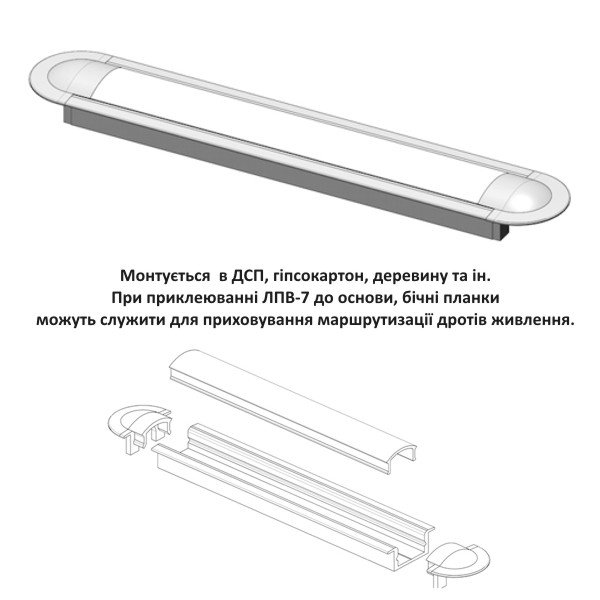 Розміри профілю ЛПВ-7, аналогічні ЛП-7, але він має бічні планки для маскування паза при врізанні профілю воснову. Довжина -2000 мм.