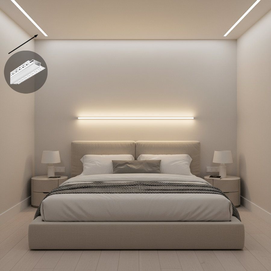 Т подібний профіль KLP2110TR призначений для врізного монтажу під шпаклівку, що дозволяє створювати практично невидимі джерела світла в стінах або стелях. Після установки в потрібне місце, лед профіль покривається шпаклівкою, залишаючи лише невелике віконце для розсіювача. Це забезпечує м'яке, рівномірне освітлення без відблисків, яке виглядає як невід'ємна частина стіни або стелі.
