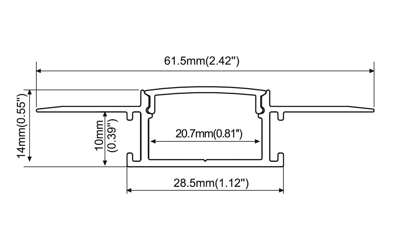 Цей врізний профіль виготовлений з високоякісного алюмінію і має срібний колір за стандартом RAL. Його довжина становить 3000 мм, ширина 28,5 мм, висота 14 мм, а місце для LED стрічки — 20,7 мм. Пластиковий розсіювач типу PC забезпечує рівномірне розсіювання світла і захищає LED стрічки від пошкоджень.