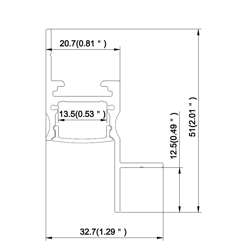 Цей врізний лед профіль виготовлений з високоякісного алюмінію і має срібний колір відповідно до стандарту RAL. Довжина профілю лед становить 2000 мм, ширина — 32,7 мм, висота — 51 мм, а місце для LED стрічки — 13,5 мм. Профіль для підсвітки обладнаний пластиковим розсіювачем типу PC, що забезпечує рівномірне розсіювання світла та захист LED стрічки.