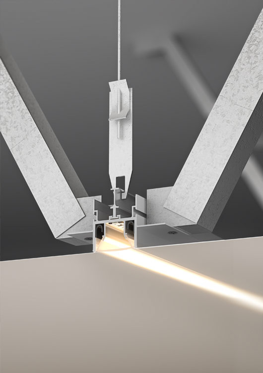Виробник передбачив можливість з'єднання декількох коробів між собою під кутом 60 градусів. Це дозволяє створювати лінійні світильники складної ламаної конфігурації. При монтажі в поверхню натяжної стелі вбудований алюмінієвий профіль для світлодіодної стрічки розташовується врівень з плівковим або тканинним полотном. Все інше ховається від очей стороннього спостерігача.