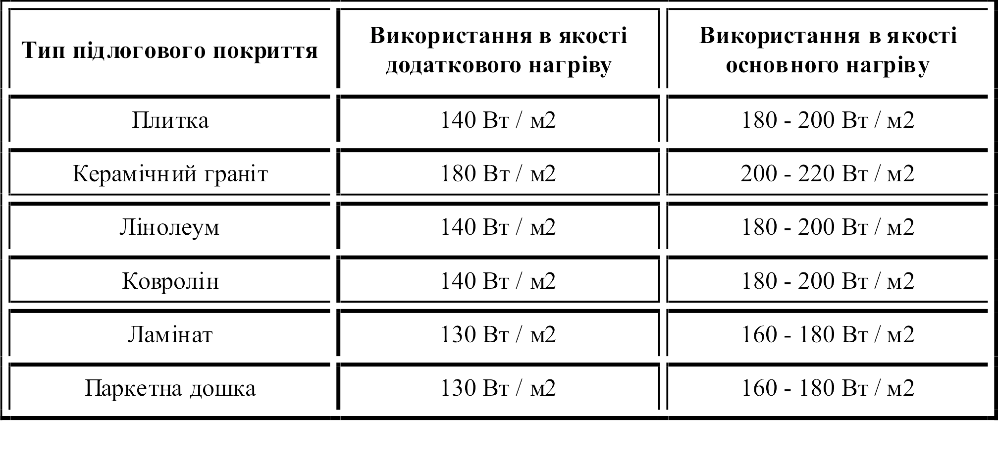 Таблиця 1. Необхідна потужність при підігріві підлоги