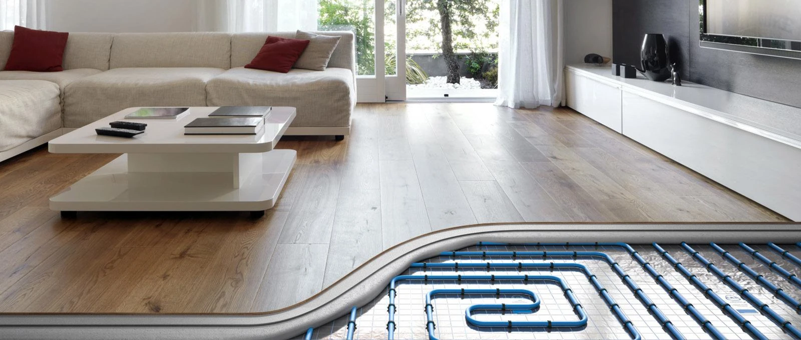 · Водяна - працює із застосуванням води або антифризу, які циркулюють в полімерних трубах. Труби контуру приєднують до джерела обігрівання (тепловий насос або котел), підключення здійснюють за допомогою розподільної гребінки. За своєю економічністю та ефективністю водяна тепла підлога є найвигіднішою. При цьому її монтаж поширений в приватних будинках та на окремо розташованих комерційних об'єктах, оскільки установка в багатоповерхових будівлях небажана з ряду причин.