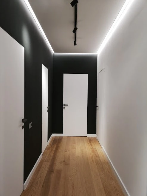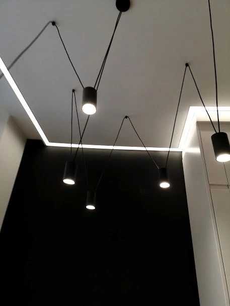Для підсвітки стелі також використовували алюмінієвий врізний профіль фірми LP, який вбудовувався у гіпсокартон та трекове освітлення фірми .