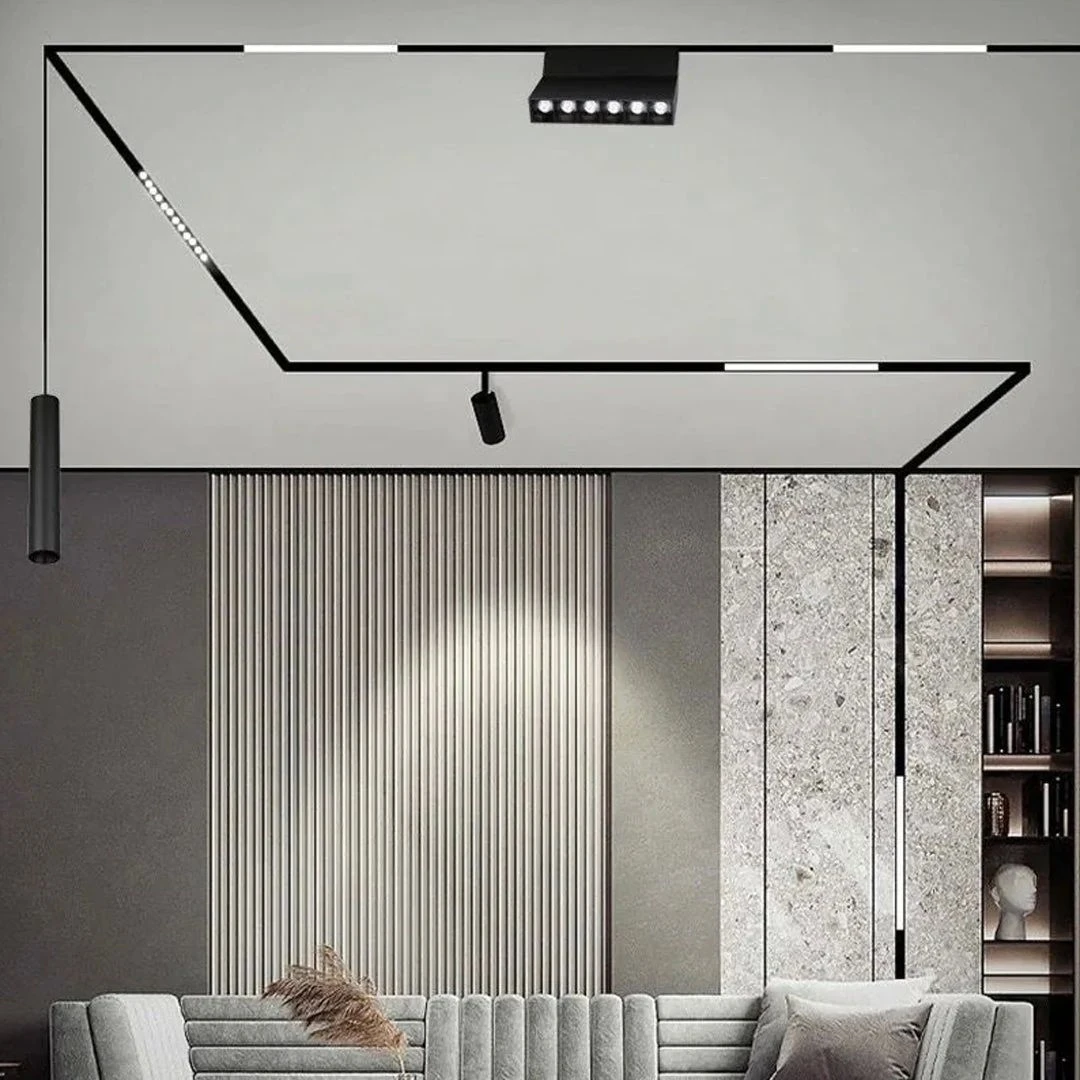 - Трекові світильники: монтуються на спеціальні рейки, що дозволяє регулювати положення та кут освітлення окремих елементів. Використовуються для акцентного освітлення або освітлення робочих зон.