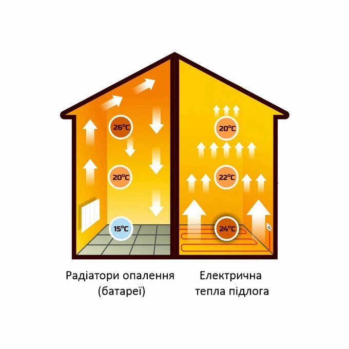 Електрична тепла підлога. це оптимальний та сучасний варіант обігріву приміщень. Ще з шкільних часів відомо, що тепло піднімається догори. Тепла підлога забезпечує рівномірний розподіл тепла по приміщенню на відміну від радіаторів. Останні працюють за принципом конвекції, тобто циркуляції теплих мас по колу. Це створює різні температурні зони в приміщенні, чим далі від батарей тим прохолодніше.