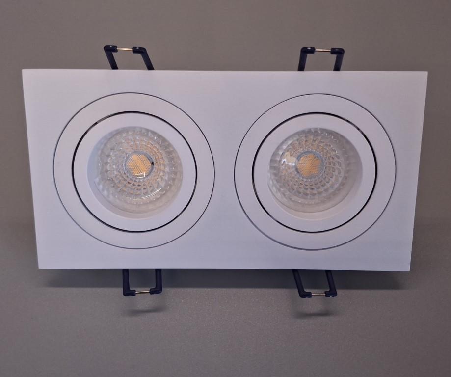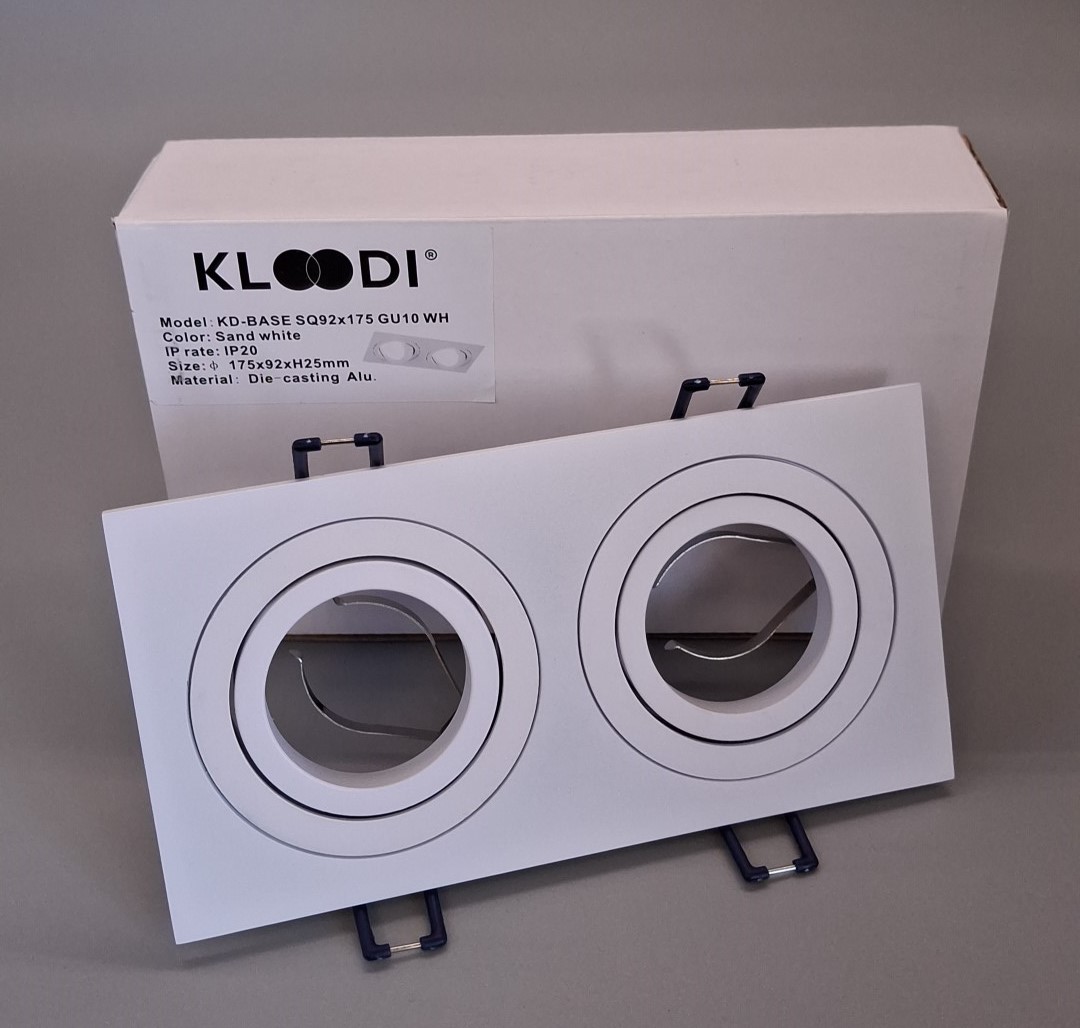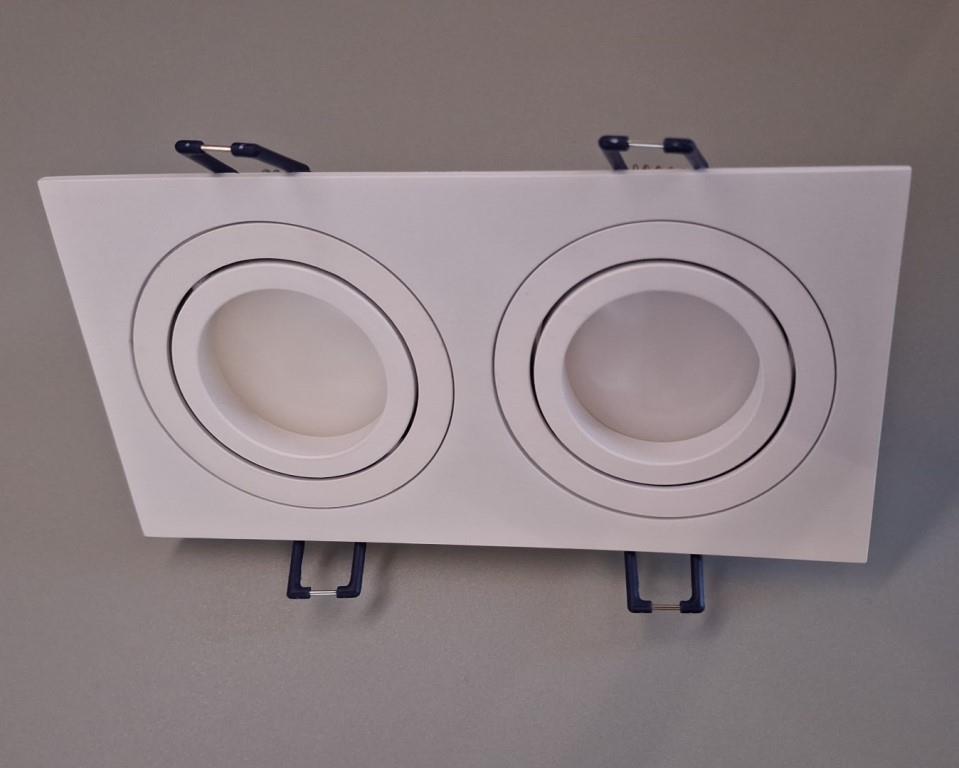 Цей врізний світильник має прямокутну форму, виготовлений з високоякісного білого алюмінію. Він оснащений поворотним механізмом і призначений для двох ламп з цоколем GU10. Завдяки компактним розмірам — висота 25 мм, ширина 92 мм та довжина 175 мм — світильник забезпечує виняткову гнучкість у виборі місця установки.