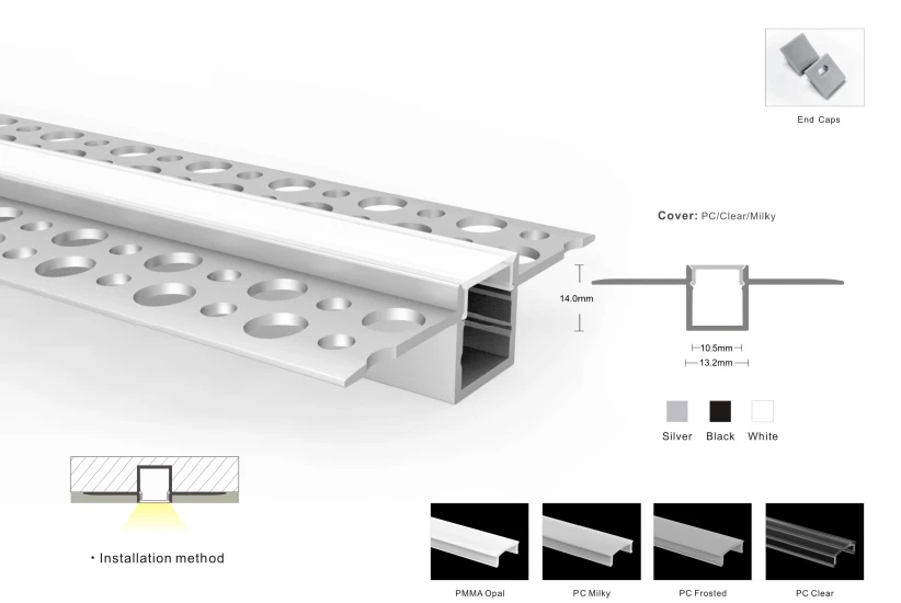 Цей профіль алюмінієвий т подібний має довжину 3000 мм, ширину 13.2 мм і висоту 14 мм. Його особливість у компактному дизайні, що дозволяє легко інтегрувати його в будь-які інтер'єрні рішення без зайвої уваги до лед профілю. Матеріал розсіювача PMMA із матовим фінішем забезпечує м'яке освітлення.