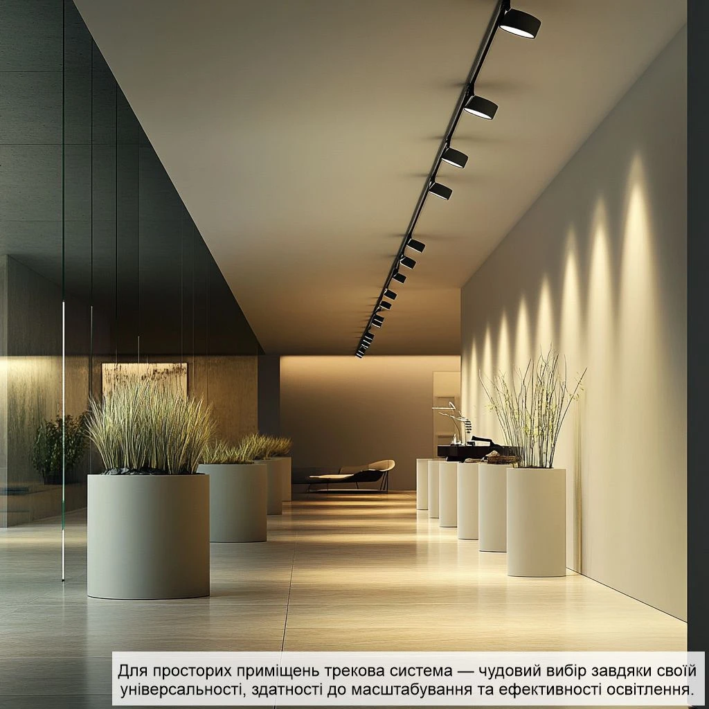 Так, трекову систему можна використовувати для освітлення великих приміщень, і це може бути дуже ефективним рішенням. Ось кілька причин, чому вона підходить для таких просторів: